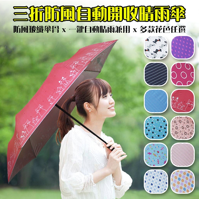 【Kasan】三折防風自動開收晴雨傘(紅點萌貓)
