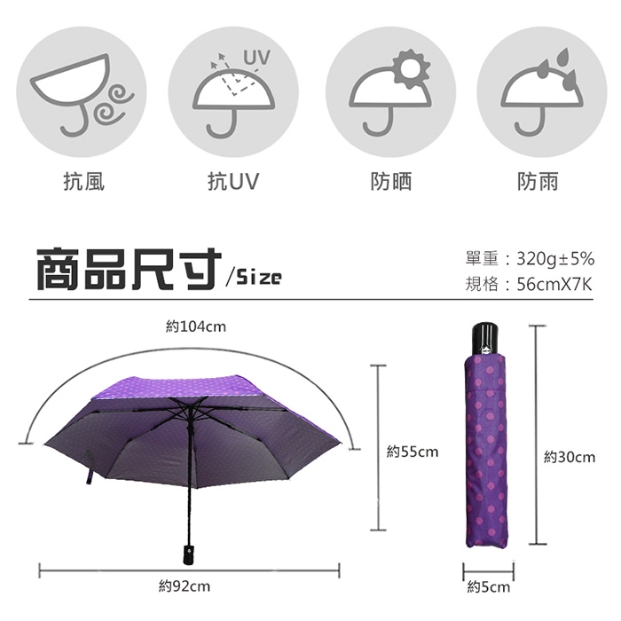 商品訊息簡述: 防風FRP玻璃纖維傘骨 翻傘不易損壞 一鍵自動開收 單手使用方便 新款12色任選 男女適用 品牌 Kasan顏色 紅色系風格元素 水玉點點傘布主材質 色膠防紫外線傘布傘骨主材